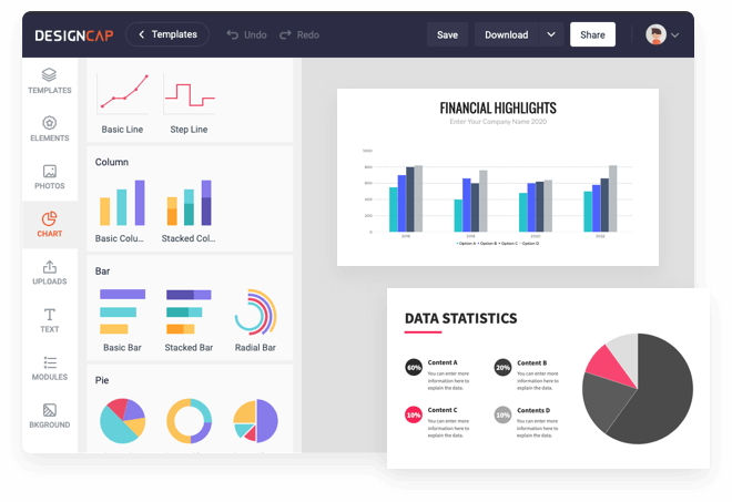 Bringen Sie Ihr Design auf die nächste Stufe, durch eingebaute Schriftwarten, Formen und Hintergründe, als auch durch Stockbilder und Symbole.